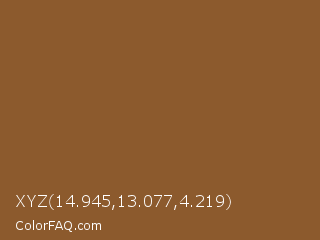 XYZ 14.945,13.077,4.219 Color is a normal orange color and the nearest color is Potters Clay #8c5738. Hex code #8c5a2d and RGB value is rgb(140,90,45). In RGB color space, this color is composed of 55% red, 35% green, 18% blue, In CMYK color space, this color is composed of 0% cyan, 36% magenta, 68% yellow , 45% black , In HSL color space, this color has a hue angle of 28° , 51% saturation and 36% lightness.