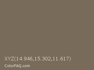 XYZ 14.946,15.302,11.617 Color is a normal orange color and the nearest color is Crocodile #736d58. Hex code #796b59 and RGB value is rgb(121,107,89). In RGB color space, this color is composed of 47% red, 42% green, 35% blue, In CMYK color space, this color is composed of 0% cyan, 12% magenta, 26% yellow , 53% black , In HSL color space, this color has a hue angle of 34° , 15% saturation and 41% lightness.