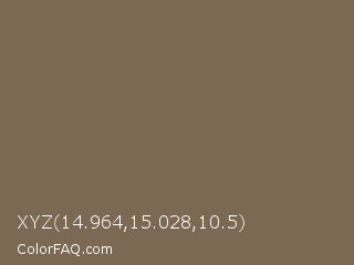 XYZ 14.964,15.028,10.5 Color is a normal orange color and the nearest color is Pastel Brown #836953. Hex code #7c6954 and RGB value is rgb(124,105,84). In RGB color space, this color is composed of 49% red, 41% green, 33% blue, In CMYK color space, this color is composed of 0% cyan, 15% magenta, 32% yellow , 51% black , In HSL color space, this color has a hue angle of 32° , 19% saturation and 41% lightness.
