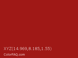 XYZ 14.969,8.185,1.55 Color is a normal red color and the nearest color is Spartan Crimson #9e1316. Hex code #a01816 and RGB value is rgb(160,24,22). In RGB color space, this color is composed of 63% red, 9% green, 9% blue, In CMYK color space, this color is composed of 0% cyan, 85% magenta, 86% yellow , 37% black , In HSL color space, this color has a hue angle of 1° , 76% saturation and 36% lightness.