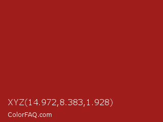 XYZ 14.972,8.383,1.928 Color is a normal red color and the nearest color is Spartan Crimson #9e1316. Hex code #9f1e1c and RGB value is rgb(159,30,28). In RGB color space, this color is composed of 62% red, 12% green, 11% blue, In CMYK color space, this color is composed of 0% cyan, 81% magenta, 82% yellow , 38% black , In HSL color space, this color has a hue angle of 1° , 70% saturation and 37% lightness.