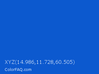 XYZ 14.986,11.728,60.505 Color is a normal blue color and the nearest color is Science Blue #0066cc. Hex code #0c59cf and RGB value is rgb(12,89,207). In RGB color space, this color is composed of 5% red, 35% green, 81% blue, In CMYK color space, this color is composed of 94% cyan, 57% magenta, 0% yellow , 19% black , In HSL color space, this color has a hue angle of 216° , 89% saturation and 43% lightness.