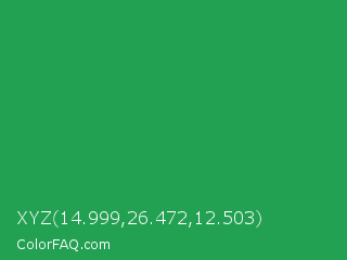XYZ 14.999,26.472,12.503 Color is a normal green color and the nearest color is Eucalyptus #278a5b. Hex code #23a153 and RGB value is rgb(35,161,83). In RGB color space, this color is composed of 14% red, 63% green, 33% blue, In CMYK color space, this color is composed of 78% cyan, 0% magenta, 48% yellow , 37% black , In HSL color space, this color has a hue angle of 143° , 64% saturation and 38% lightness.