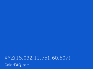 XYZ 15.032,11.751,60.507 Color is a normal blue color and the nearest color is Science Blue #0066cc. Hex code #0f59cf and RGB value is rgb(15,89,207). In RGB color space, this color is composed of 6% red, 35% green, 81% blue, In CMYK color space, this color is composed of 93% cyan, 57% magenta, 0% yellow , 19% black , In HSL color space, this color has a hue angle of 217° , 86% saturation and 44% lightness.