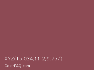 XYZ 15.034,11.2,9.757 Color is a normal red color and the nearest color is Copper Rust #944747. Hex code #8d4a54 and RGB value is rgb(141,74,84). In RGB color space, this color is composed of 55% red, 29% green, 33% blue, In CMYK color space, this color is composed of 0% cyan, 48% magenta, 40% yellow , 45% black , In HSL color space, this color has a hue angle of 351° , 31% saturation and 42% lightness.