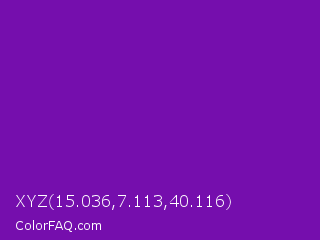 XYZ 15.036,7.113,40.116 Color is a normal purple color and the nearest color is Violet RYB #8601af. Hex code #750ead and RGB value is rgb(117,14,173). In RGB color space, this color is composed of 46% red, 5% green, 68% blue, In CMYK color space, this color is composed of 32% cyan, 92% magenta, 0% yellow , 32% black , In HSL color space, this color has a hue angle of 279° , 85% saturation and 37% lightness.