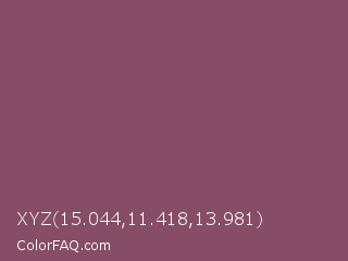 XYZ 15.044,11.418,13.981 Color is a normal rose color and the nearest color is Twilight Lavender #8a496b. Hex code #874d66 and RGB value is rgb(135,77,102). In RGB color space, this color is composed of 53% red, 30% green, 40% blue, In CMYK color space, this color is composed of 0% cyan, 43% magenta, 24% yellow , 47% black , In HSL color space, this color has a hue angle of 334° , 27% saturation and 42% lightness.