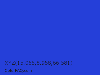 XYZ 15.065,8.958,66.581 Color is a normal blue color and the nearest color is Palatinate Blue #273be2. Hex code #253fd9 and RGB value is rgb(37,63,217). In RGB color space, this color is composed of 15% red, 25% green, 85% blue, In CMYK color space, this color is composed of 83% cyan, 71% magenta, 0% yellow , 15% black , In HSL color space, this color has a hue angle of 231° , 71% saturation and 50% lightness.