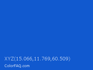XYZ 15.066,11.769,60.509 Color is a normal blue color and the nearest color is Denim #1560bd. Hex code #1159cf and RGB value is rgb(17,89,207). In RGB color space, this color is composed of 7% red, 35% green, 81% blue, In CMYK color space, this color is composed of 92% cyan, 57% magenta, 0% yellow , 19% black , In HSL color space, this color has a hue angle of 217° , 85% saturation and 44% lightness.