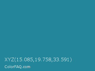 XYZ 15.085,19.758,33.591 Color is a normal cyan color and the nearest color is Jelly Bean #297b9a. Hex code #24869a and RGB value is rgb(36,134,154). In RGB color space, this color is composed of 14% red, 53% green, 60% blue, In CMYK color space, this color is composed of 77% cyan, 13% magenta, 0% yellow , 40% black , In HSL color space, this color has a hue angle of 190° , 62% saturation and 37% lightness.