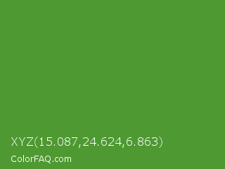 XYZ 15.087,24.624,6.863 Color is a normal green color and the nearest color is May Green #4c9141. Hex code #4e9931 and RGB value is rgb(78,153,49). In RGB color space, this color is composed of 31% red, 60% green, 19% blue, In CMYK color space, this color is composed of 49% cyan, 0% magenta, 68% yellow , 40% black , In HSL color space, this color has a hue angle of 103° , 51% saturation and 40% lightness.