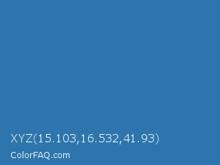 XYZ 15.103,16.532,41.93 Color is a normal blue color and the nearest color is Astral #327da0. Hex code #2d76ad and RGB value is rgb(45,118,173). In RGB color space, this color is composed of 18% red, 46% green, 68% blue, In CMYK color space, this color is composed of 74% cyan, 32% magenta, 0% yellow , 32% black , In HSL color space, this color has a hue angle of 206° , 59% saturation and 43% lightness.