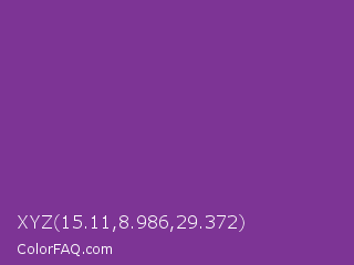 XYZ 15.11,8.986,29.372 Color is a normal purple color and the nearest color is Vivid Violet #803790. Hex code #7d3495 and RGB value is rgb(125,52,149). In RGB color space, this color is composed of 49% red, 20% green, 58% blue, In CMYK color space, this color is composed of 16% cyan, 65% magenta, 0% yellow , 42% black , In HSL color space, this color has a hue angle of 285° , 48% saturation and 39% lightness.
