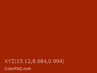 XYZ 15.12,8.684,0.994 Color is a normal red color and the nearest color is Totem Pole #991b07. Hex code #a02304 and RGB value is rgb(160,35,4). In RGB color space, this color is composed of 63% red, 14% green, 2% blue, In CMYK color space, this color is composed of 0% cyan, 78% magenta, 98% yellow , 37% black , In HSL color space, this color has a hue angle of 12° , 95% saturation and 32% lightness.