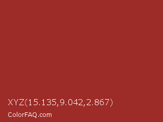 XYZ 15.135,9.042,2.867 Color is a normal red color and the nearest color is Red Brown #a52a2a. Hex code #9d2b27 and RGB value is rgb(157,43,39). In RGB color space, this color is composed of 62% red, 17% green, 15% blue, In CMYK color space, this color is composed of 0% cyan, 73% magenta, 75% yellow , 38% black , In HSL color space, this color has a hue angle of 2° , 60% saturation and 38% lightness.