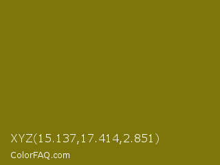 XYZ 15.137,17.414,2.851 Color is a dark yellow color and the nearest color is Olive #808000. Hex code #7e760a and RGB value is rgb(126,118,10). In RGB color space, this color is composed of 49% red, 46% green, 4% blue, In CMYK color space, this color is composed of 0% cyan, 6% magenta, 92% yellow , 51% black , In HSL color space, this color has a hue angle of 56° , 85% saturation and 27% lightness.