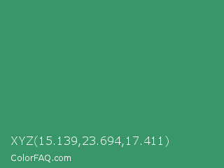 XYZ 15.139,23.694,17.411 Color is a normal green color and the nearest color is Illuminating Emerald #319177. Hex code #38966a and RGB value is rgb(56,150,106). In RGB color space, this color is composed of 22% red, 59% green, 42% blue, In CMYK color space, this color is composed of 63% cyan, 0% magenta, 29% yellow , 41% black , In HSL color space, this color has a hue angle of 152° , 46% saturation and 40% lightness.