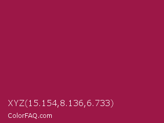XYZ 15.154,8.136,6.733 Color is a normal rose color and the nearest color is Big Dip O Ruby #9c2542. Hex code #9c1747 and RGB value is rgb(156,23,71). In RGB color space, this color is composed of 61% red, 9% green, 28% blue, In CMYK color space, this color is composed of 0% cyan, 85% magenta, 54% yellow , 39% black , In HSL color space, this color has a hue angle of 338° , 74% saturation and 35% lightness.
