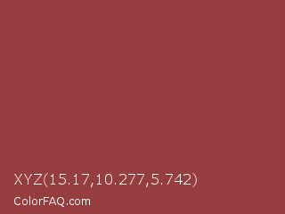 XYZ 15.17,10.277,5.742 Color is a normal red color and the nearest color is Smoky Topaz #933d41. Hex code #963e3e and RGB value is rgb(150,62,62). In RGB color space, this color is composed of 59% red, 24% green, 24% blue, In CMYK color space, this color is composed of 0% cyan, 59% magenta, 59% yellow , 41% black , In HSL color space, this color has a hue angle of 0° , 42% saturation and 42% lightness.