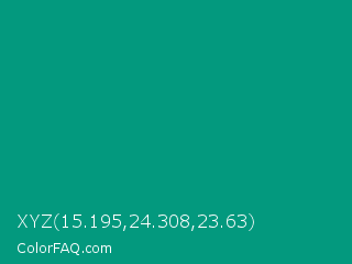 XYZ 15.195,24.308,23.63 Color is a normal cyan color and the nearest color is Paolo Veronese Green #009b7d. Hex code #03997e and RGB value is rgb(3,153,126). In RGB color space, this color is composed of 1% red, 60% green, 49% blue, In CMYK color space, this color is composed of 98% cyan, 0% magenta, 18% yellow , 40% black , In HSL color space, this color has a hue angle of 169° , 96% saturation and 31% lightness.