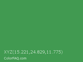 XYZ 15.221,24.829,11.775 Color is a normal green color and the nearest color is Fruit Salad #4f9d5d. Hex code #419a51 and RGB value is rgb(65,154,81). In RGB color space, this color is composed of 25% red, 60% green, 32% blue, In CMYK color space, this color is composed of 58% cyan, 0% magenta, 47% yellow , 40% black , In HSL color space, this color has a hue angle of 131° , 41% saturation and 43% lightness.