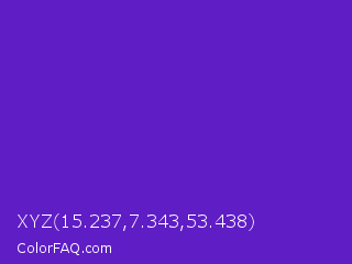 XYZ 15.237,7.343,53.438 Color is a normal violet color and the nearest color is Purple Heart Crayola #652dc1. Hex code #5f1dc5 and RGB value is rgb(95,29,197). In RGB color space, this color is composed of 37% red, 11% green, 77% blue, In CMYK color space, this color is composed of 52% cyan, 85% magenta, 0% yellow , 23% black , In HSL color space, this color has a hue angle of 264° , 74% saturation and 44% lightness.