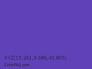 XYZ 15.261,9.686,45.865 Color is a normal indigo color and the nearest color is Plump Purple #5946b2. Hex code #6041b7 and RGB value is rgb(96,65,183). In RGB color space, this color is composed of 38% red, 25% green, 72% blue, In CMYK color space, this color is composed of 48% cyan, 64% magenta, 0% yellow , 28% black , In HSL color space, this color has a hue angle of 256° , 48% saturation and 49% lightness.