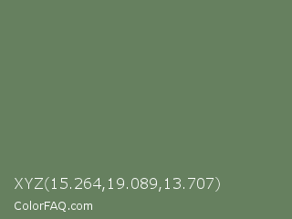 XYZ 15.264,19.089,13.707 Color is a normal green color and the nearest color is Glade Green #61845f. Hex code #66805f and RGB value is rgb(102,128,95). In RGB color space, this color is composed of 40% red, 50% green, 37% blue, In CMYK color space, this color is composed of 20% cyan, 0% magenta, 26% yellow , 50% black , In HSL color space, this color has a hue angle of 107° , 15% saturation and 44% lightness.