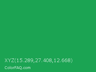XYZ 15.289,27.408,12.668 Color is a normal green color and the nearest color is Green Pigment #00a550. Hex code #1ba453 and RGB value is rgb(27,164,83). In RGB color space, this color is composed of 11% red, 64% green, 33% blue, In CMYK color space, this color is composed of 84% cyan, 0% magenta, 49% yellow , 36% black , In HSL color space, this color has a hue angle of 145° , 72% saturation and 37% lightness.