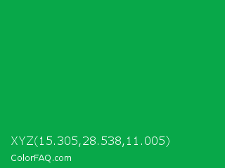 XYZ 15.305,28.538,11.005 Color is a normal green color and the nearest color is Green Pigment #00a550. Hex code #08a849 and RGB value is rgb(8,168,73). In RGB color space, this color is composed of 3% red, 66% green, 29% blue, In CMYK color space, this color is composed of 95% cyan, 0% magenta, 57% yellow , 34% black , In HSL color space, this color has a hue angle of 144° , 91% saturation and 35% lightness.