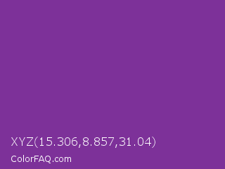 XYZ 15.306,8.857,31.04 Color is a normal purple color and the nearest color is Vivid Violet #803790. Hex code #7d3199 and RGB value is rgb(125,49,153). In RGB color space, this color is composed of 49% red, 19% green, 60% blue, In CMYK color space, this color is composed of 18% cyan, 68% magenta, 0% yellow , 40% black , In HSL color space, this color has a hue angle of 284° , 51% saturation and 40% lightness.