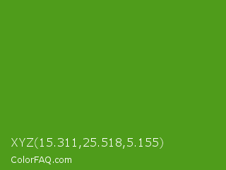 XYZ 15.311,25.518,5.155 Color is a normal green color and the nearest color is Vida Loca #549019. Hex code #4f9c1b and RGB value is rgb(79,156,27). In RGB color space, this color is composed of 31% red, 61% green, 11% blue, In CMYK color space, this color is composed of 49% cyan, 0% magenta, 83% yellow , 39% black , In HSL color space, this color has a hue angle of 96° , 70% saturation and 36% lightness.