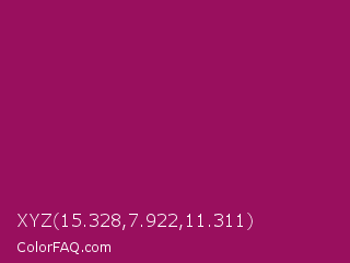 XYZ 15.328,7.922,11.311 Color is a normal magenta color and the nearest color is Jazzberry Jam #a50b5e. Hex code #990f5e and RGB value is rgb(153,15,94). In RGB color space, this color is composed of 60% red, 6% green, 37% blue, In CMYK color space, this color is composed of 0% cyan, 90% magenta, 39% yellow , 40% black , In HSL color space, this color has a hue angle of 326° , 82% saturation and 33% lightness.
