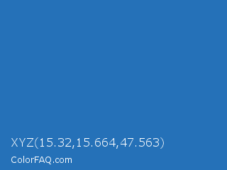 XYZ 15.32,15.664,47.563 Color is a normal blue color and the nearest color is Mariner #286acd. Hex code #2571b8 and RGB value is rgb(37,113,184). In RGB color space, this color is composed of 15% red, 44% green, 72% blue, In CMYK color space, this color is composed of 80% cyan, 39% magenta, 0% yellow , 28% black , In HSL color space, this color has a hue angle of 209° , 67% saturation and 43% lightness.