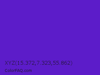 XYZ 15.372,7.323,55.862 Color is a normal violet color and the nearest color is Purple Heart Crayola #652dc1. Hex code #5c1cc9 and RGB value is rgb(92,28,201). In RGB color space, this color is composed of 36% red, 11% green, 79% blue, In CMYK color space, this color is composed of 54% cyan, 86% magenta, 0% yellow , 21% black , In HSL color space, this color has a hue angle of 262° , 76% saturation and 45% lightness.