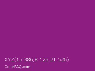 XYZ 15.386,8.126,21.526 Color is a normal magenta color and the nearest color is Razzmic Berry Crayola #843179. Hex code #8d1d81 and RGB value is rgb(141,29,129). In RGB color space, this color is composed of 55% red, 11% green, 51% blue, In CMYK color space, this color is composed of 0% cyan, 79% magenta, 9% yellow , 45% black , In HSL color space, this color has a hue angle of 306° , 66% saturation and 33% lightness.