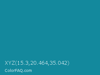XYZ 15.3,20.464,35.042 Color is a normal cyan color and the nearest color is Blue Chill #0c8990. Hex code #13899d and RGB value is rgb(19,137,157). In RGB color space, this color is composed of 7% red, 54% green, 62% blue, In CMYK color space, this color is composed of 88% cyan, 13% magenta, 0% yellow , 38% black , In HSL color space, this color has a hue angle of 189° , 78% saturation and 35% lightness.