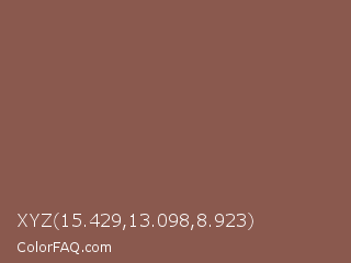 XYZ 15.429,13.098,8.923 Color is a normal red color and the nearest color is Spicy Mix #8b5f4d. Hex code #8a594e and RGB value is rgb(138,89,78). In RGB color space, this color is composed of 54% red, 35% green, 31% blue, In CMYK color space, this color is composed of 0% cyan, 36% magenta, 43% yellow , 46% black , In HSL color space, this color has a hue angle of 11° , 28% saturation and 42% lightness.