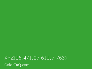 XYZ 15.471,27.611,7.763 Color is a normal green color and the nearest color is Wageningen Green #34b233. Hex code #37a434 and RGB value is rgb(55,164,52). In RGB color space, this color is composed of 22% red, 64% green, 20% blue, In CMYK color space, this color is composed of 66% cyan, 0% magenta, 68% yellow , 36% black , In HSL color space, this color has a hue angle of 118° , 52% saturation and 42% lightness.