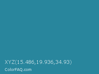 XYZ 15.486,19.936,34.93 Color is a normal cyan color and the nearest color is Jelly Bean #297b9a. Hex code #28869d and RGB value is rgb(40,134,157). In RGB color space, this color is composed of 16% red, 53% green, 62% blue, In CMYK color space, this color is composed of 75% cyan, 15% magenta, 0% yellow , 38% black , In HSL color space, this color has a hue angle of 192° , 59% saturation and 39% lightness.
