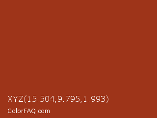 XYZ 15.504,9.795,1.993 Color is a normal red color and the nearest color is Cognac #9f381d. Hex code #9e3419 and RGB value is rgb(158,52,25). In RGB color space, this color is composed of 62% red, 20% green, 10% blue, In CMYK color space, this color is composed of 0% cyan, 67% magenta, 84% yellow , 38% black , In HSL color space, this color has a hue angle of 12° , 73% saturation and 36% lightness.