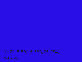XYZ 15.509,6.583,76.054 Color is a normal indigo color and the nearest color is Bluebonnet #1c1cf0. Hex code #290fe7 and RGB value is rgb(41,15,231). In RGB color space, this color is composed of 16% red, 6% green, 91% blue, In CMYK color space, this color is composed of 82% cyan, 94% magenta, 0% yellow , 9% black , In HSL color space, this color has a hue angle of 247° , 88% saturation and 48% lightness.