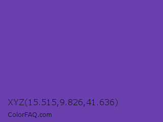 XYZ 15.515,9.826,41.636 Color is a normal violet color and the nearest color is Studio #714ab2. Hex code #6a40af and RGB value is rgb(106,64,175). In RGB color space, this color is composed of 42% red, 25% green, 69% blue, In CMYK color space, this color is composed of 39% cyan, 63% magenta, 0% yellow , 31% black , In HSL color space, this color has a hue angle of 263° , 46% saturation and 47% lightness.