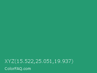 XYZ 15.522,25.051,19.937 Color is a normal green color and the nearest color is Illuminating Emerald #319177. Hex code #259b72 and RGB value is rgb(37,155,114). In RGB color space, this color is composed of 15% red, 61% green, 45% blue, In CMYK color space, this color is composed of 76% cyan, 0% magenta, 26% yellow , 39% black , In HSL color space, this color has a hue angle of 159° , 61% saturation and 38% lightness.