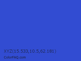 XYZ 15.533,10.5,62.181 Color is a normal blue color and the nearest color is New Car #214fc6. Hex code #324cd2 and RGB value is rgb(50,76,210). In RGB color space, this color is composed of 20% red, 30% green, 82% blue, In CMYK color space, this color is composed of 76% cyan, 64% magenta, 0% yellow , 18% black , In HSL color space, this color has a hue angle of 230° , 64% saturation and 51% lightness.