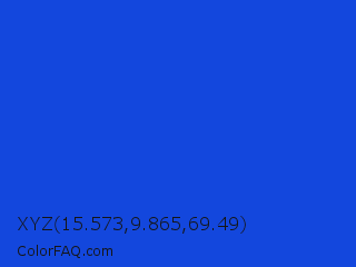 XYZ 15.573,9.865,69.49 Color is a normal blue color and the nearest color is Palatinate Blue #273be2. Hex code #1347dd and RGB value is rgb(19,71,221). In RGB color space, this color is composed of 7% red, 28% green, 87% blue, In CMYK color space, this color is composed of 91% cyan, 68% magenta, 0% yellow , 13% black , In HSL color space, this color has a hue angle of 225° , 84% saturation and 47% lightness.