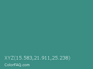 XYZ 15.583,21.911,25.238 Color is a normal cyan color and the nearest color is Lochinvar #2c8c84. Hex code #3a8e84 and RGB value is rgb(58,142,132). In RGB color space, this color is composed of 23% red, 56% green, 52% blue, In CMYK color space, this color is composed of 59% cyan, 0% magenta, 7% yellow , 44% black , In HSL color space, this color has a hue angle of 173° , 42% saturation and 39% lightness.