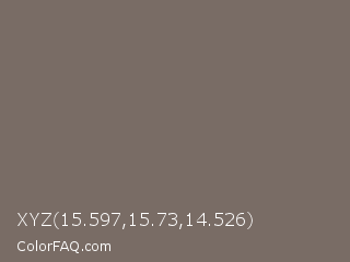 XYZ 15.597,15.73,14.526 Color is a normal orange color and the nearest color is Sandstone #796d62. Hex code #796c65 and RGB value is rgb(121,108,101). In RGB color space, this color is composed of 47% red, 42% green, 40% blue, In CMYK color space, this color is composed of 0% cyan, 11% magenta, 17% yellow , 53% black , In HSL color space, this color has a hue angle of 21° , 9% saturation and 44% lightness.