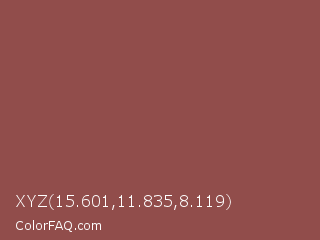 XYZ 15.601,11.835,8.119 Color is a normal red color and the nearest color is Copper Rust #944747. Hex code #914d4b and RGB value is rgb(145,77,75). In RGB color space, this color is composed of 57% red, 30% green, 29% blue, In CMYK color space, this color is composed of 0% cyan, 47% magenta, 48% yellow , 43% black , In HSL color space, this color has a hue angle of 2° , 32% saturation and 43% lightness.