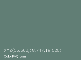 XYZ 15.602,18.747,19.626 Color is a normal green color and the nearest color is Viridian Green #678975. Hex code #617e75 and RGB value is rgb(97,126,117). In RGB color space, this color is composed of 38% red, 49% green, 46% blue, In CMYK color space, this color is composed of 23% cyan, 0% magenta, 7% yellow , 51% black , In HSL color space, this color has a hue angle of 161° , 13% saturation and 44% lightness.